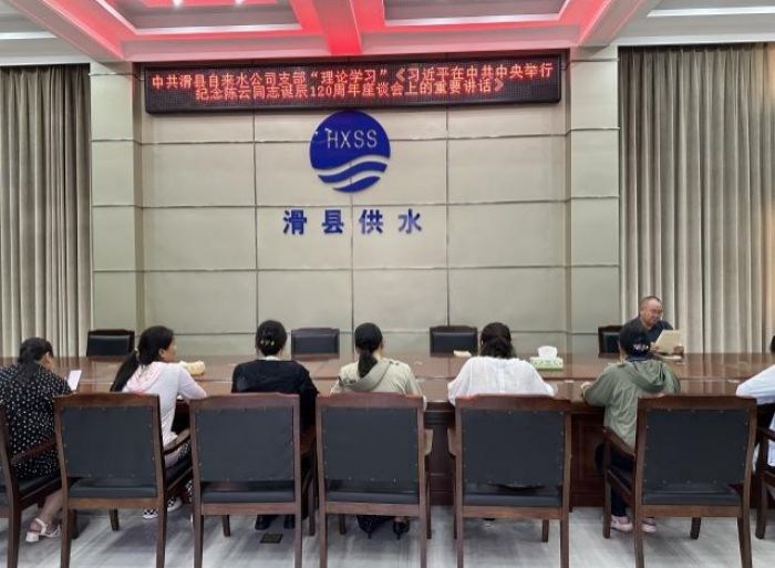 8月8日上午,中共滑县自来水公司支部在公司大会议室召开会议,组织开展“理论学习”《中共中央举行纪念陈云同志诞辰120周年座谈会 习近平发表重要讲话》,支部组织委员、经理助理耿育林同志主持学习,公司党员、中层副职以上及行政科室全体参加了会议。