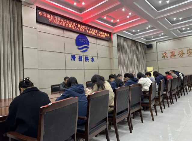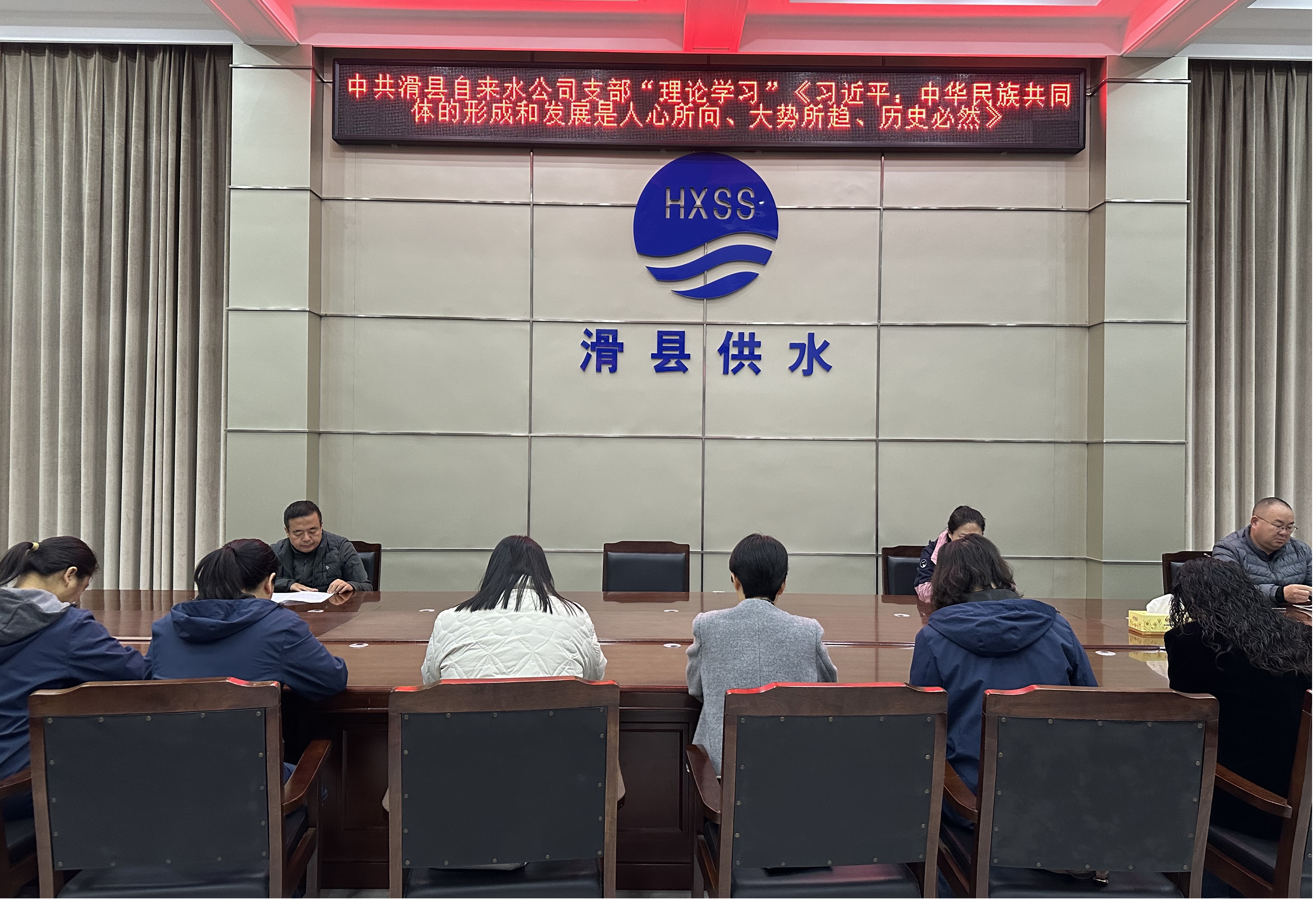 11月7日上午,中共滑县自来水公司支部在公司大会议室召开会议,组织开展“理论学习”《习近平:中华民族共同体的形成和发展是人心所向、大势所趋、历史必然》,支部宣传委员、三水厂厂长卢飞同志主持学习,公司党员、中层副职以上及行政科室全体参加了会议。