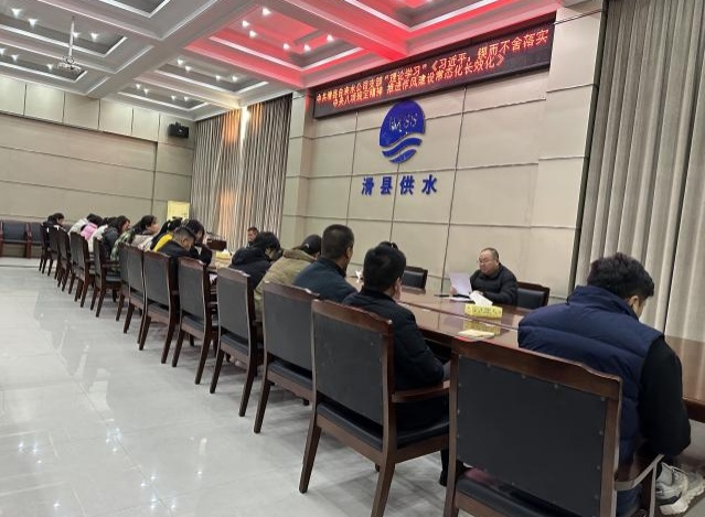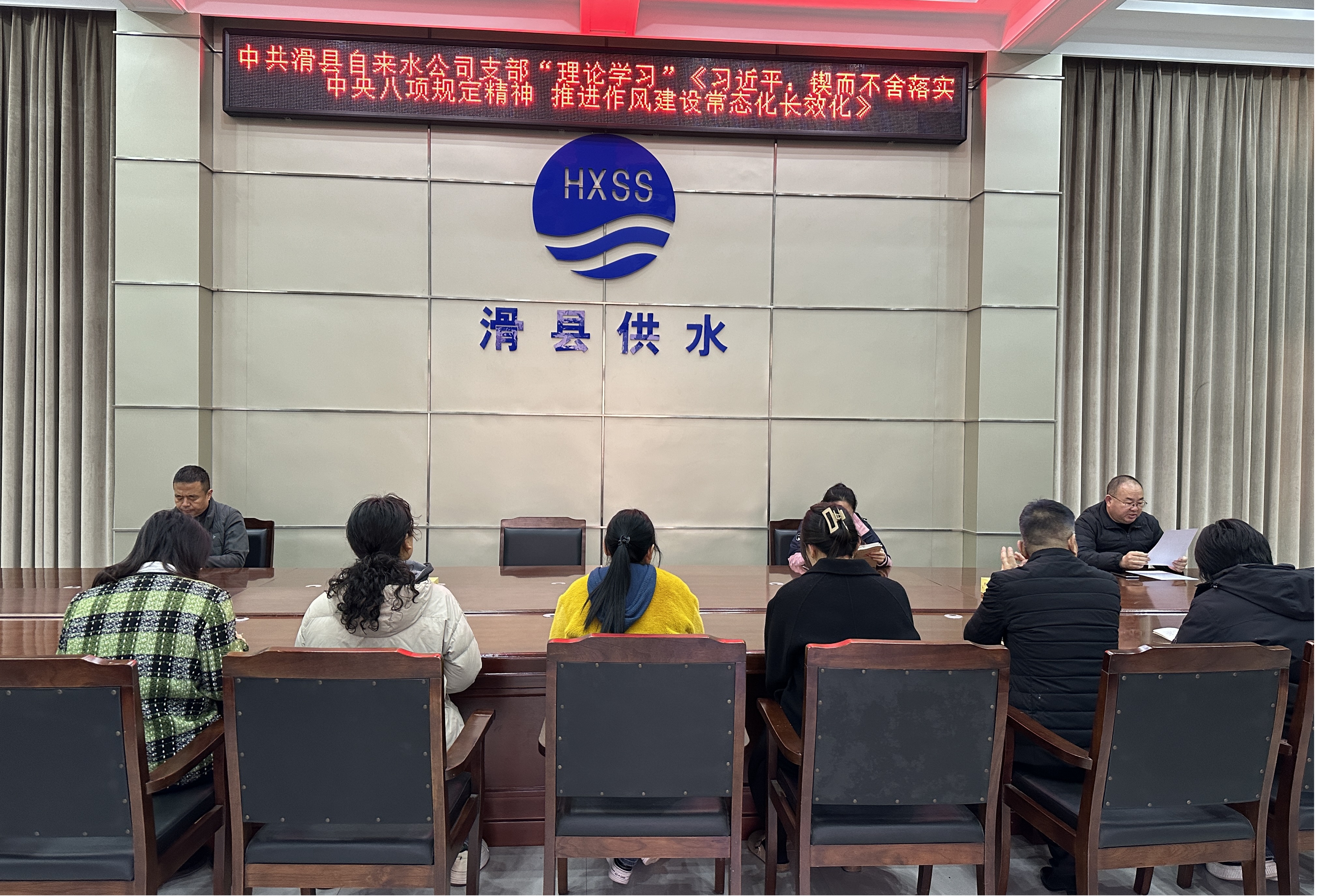 11月21日上午,中共滑县自来水公司支部在公司大会议室召开会议,组织开展“理论学习”《习近平:锲而不舍落实中央八项规定精神 推进作风建设常态化长效化》,支部组织委员、经理助理耿育林同志主持学习,公司党员、中层副职以上及行政科室全体参加了会议。